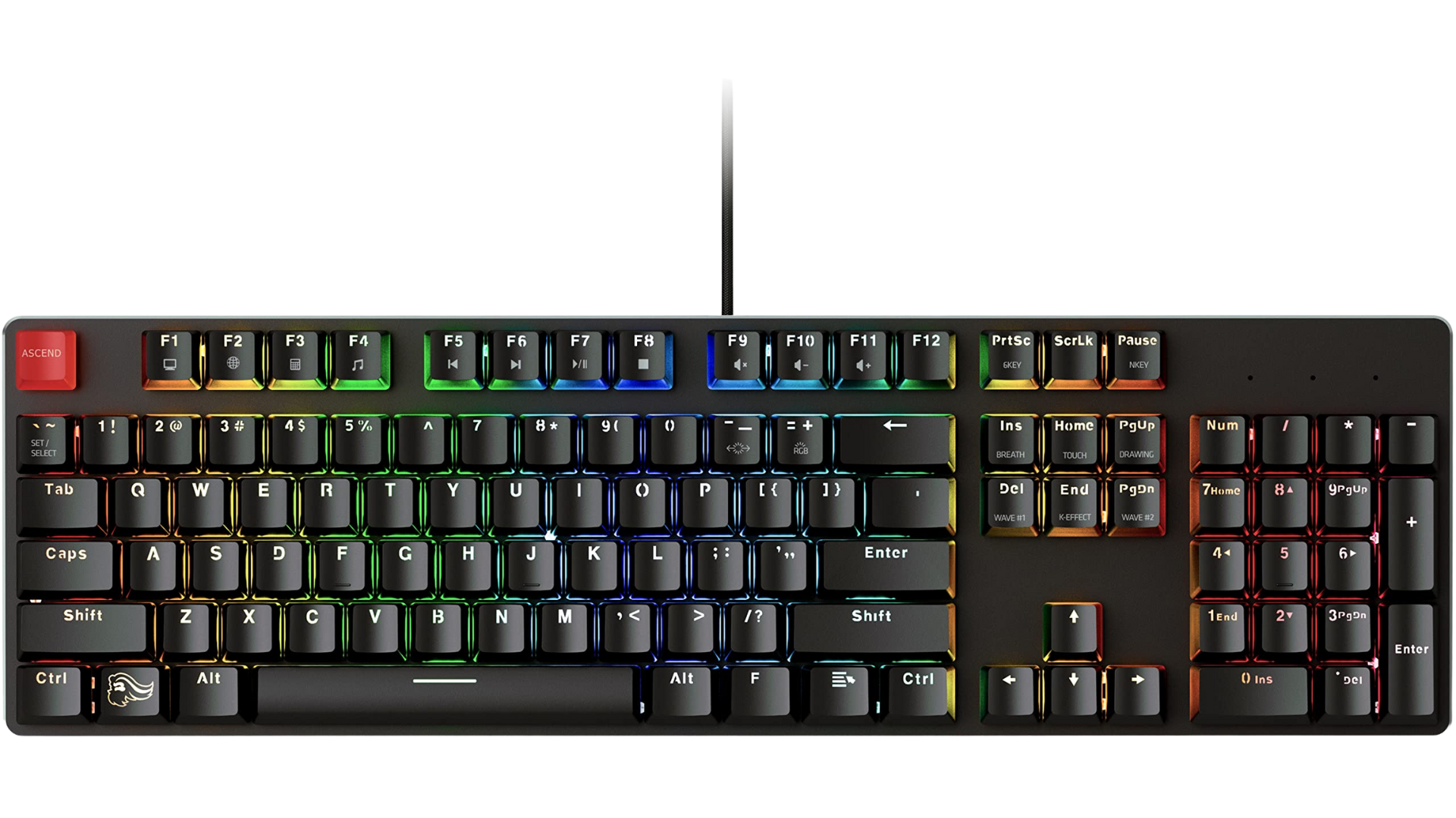 • Full-size 104-key mechanical layout — standard layout ideal for gaming + typing + productivity.